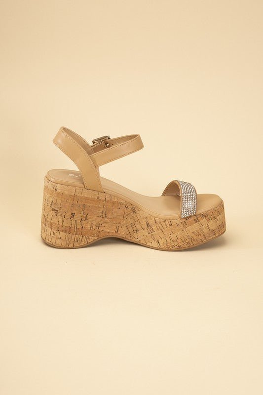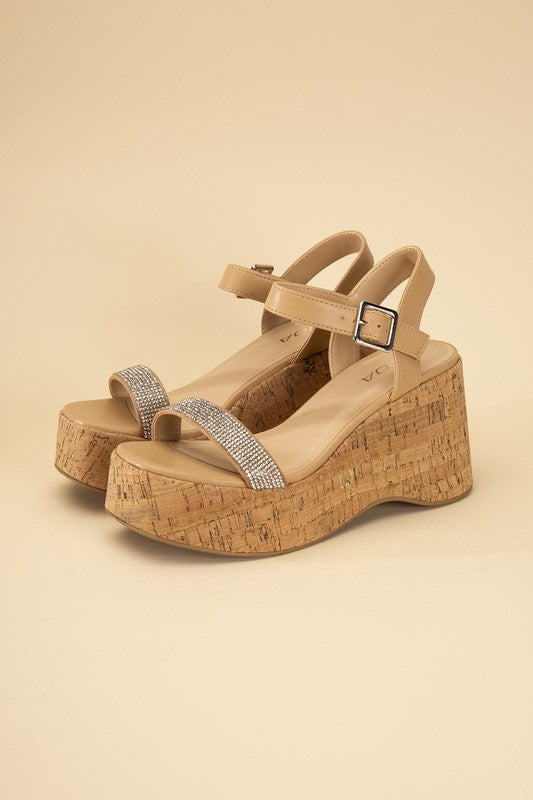 Rhinestone strap wedge sandal. A glamorous and chic choice that effortlessly elevates your summer footwear collection. These sandals feature sparkling rhinestone embellishments on the straps, adding a touch of elegance and dazzle to your every step.